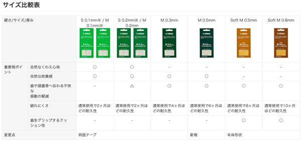 ・0.5mm(Mサイズのみ)...自然なくわえ心地、自然な吹奏感、歯や頭蓋骨へ伝わる不快な振動の軽減、耐久性平均6ヶ月程(個人差あり)