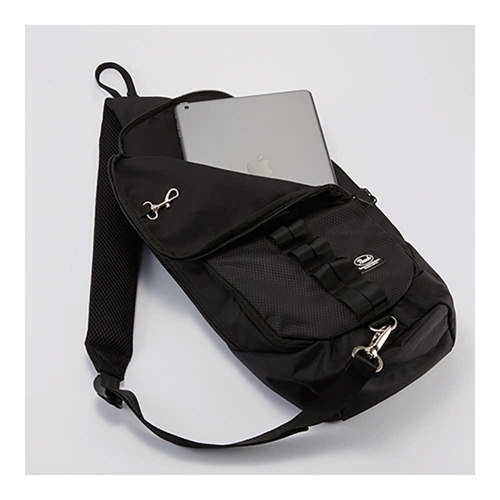 襷(タスキ)掛けタイプで、約5~6ペア収納可能。フロアタムに引っ掛けるフック付で、スマートホンや財布、タブレット等も収納可能。