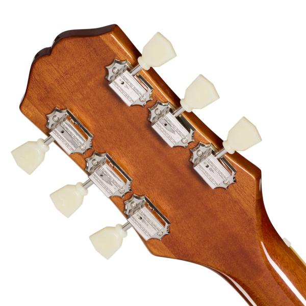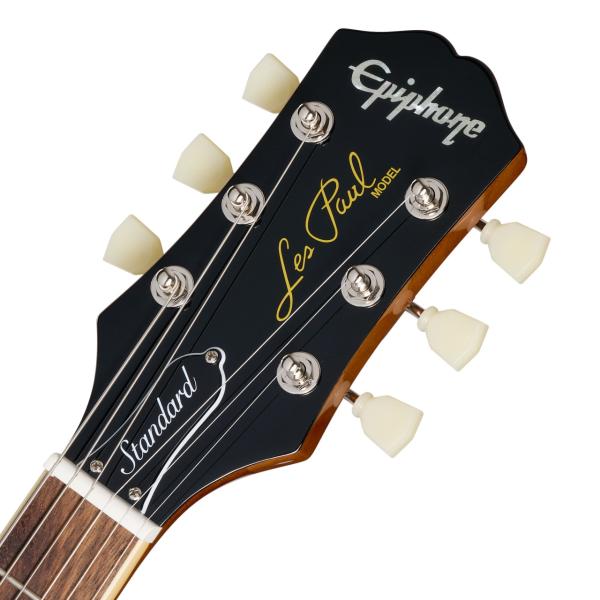 エピフォン・レスポール・スタンダード 50s は、エピフォン“Inspired by Gibson”コレクションを代表する1本です。1950年代製のレスポールのフィーリングとトーンが見事なまでに再現されています。 エピフォンとレス・ポール氏(偉大なギタリスト~ミュージシャンであり発明家!!)の長い友情関係は1940年にまで遡ります。若きレス・ポール氏は、当時マンハッタンにあったエピフォン工房で夜な夜な試作を重ね、世界初のソリッドボディ・エレクトリックギターのひとつと言われる"the Log"を作り上げました。そして"the Log”での成果が後々、今日も多くのギタープレイヤーにとって最上のエレクトリックギターとして垂涎の的である、レスポール・モデルの開発・誕生へと反映されていったのです。 ボディ・トップにはメイプルが貼られ、上面にはAAA グレードのフレイム・メイプル化粧板があしらわれています。1959ラウンド・ミディアム・Cシェイプのネックにはバインディングが施され、ロング・ネック・テノン方式でボディにジョイントされています。ローレル指板にはクラシカルなディッシュ・インレイが施され、カラマズー・ヘッドストックにはヴィンテージ・デラックス・チューナーを搭載。電装系には定評のある2基のProbuckerハムバッカー・ピックアップ、ダイヤル・ポインタ付きのゴールド・トップハット・ノブを採用。Graph Techナット、CTSポット、往時の製法に則った配線など、拘りの仕様群により魅力が一層高められています。Epiphoneプレミアム・ギグバッグが付属となります。