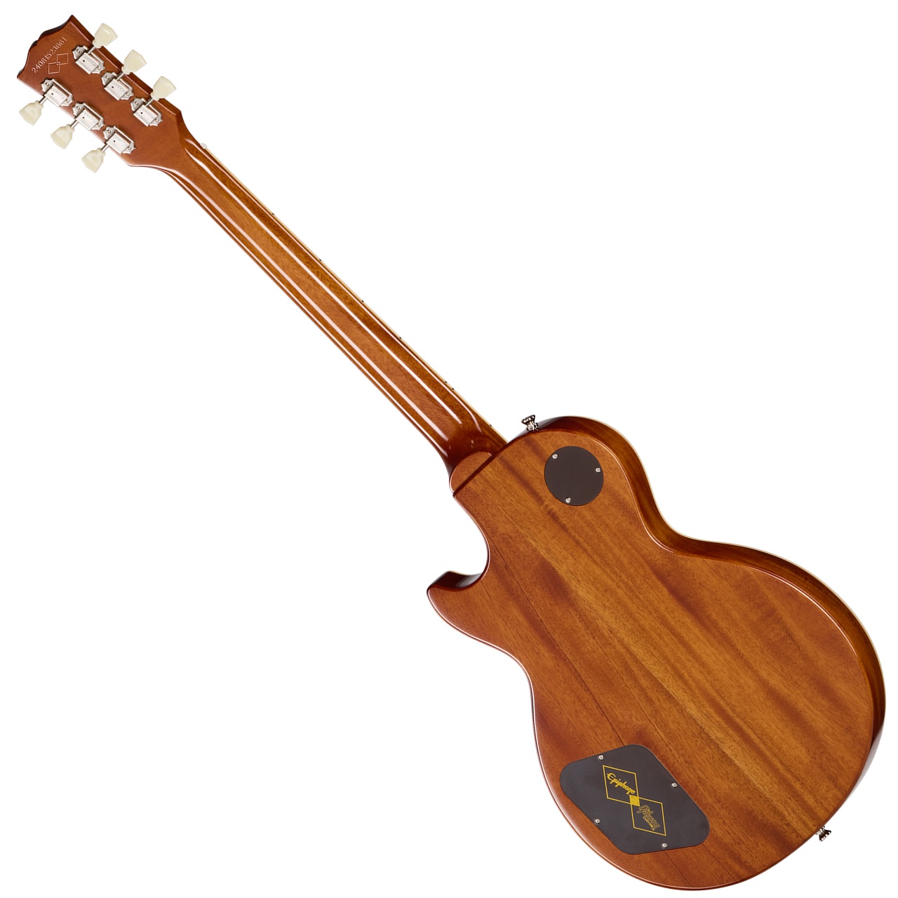 ネックにはワンピース・マホガニーを使用し、50年代スタイルのラウンド・ミディアムCプロファイルとロングネック・テノンを採用。安定した演奏性と豊かなサステインを実現します。バインディングを施したローズウッド指板にはマザー・オブ・パールのトラペゾイド・インレイを備え、22本のミディアム・ジャンボ・フレットを搭載。ギブソンと同様のオープンブック型ヘッドストックには、エイジド加工を施したマザー・オブ・パールのEpiphoneロゴと、シルクスクリーン印刷されたゴールド色の「Les Paul Model」の文字が入ります。さらに、サイドドットの位置やサイズまで1957年当時のLes Paul Standardと同様に設計されています。
