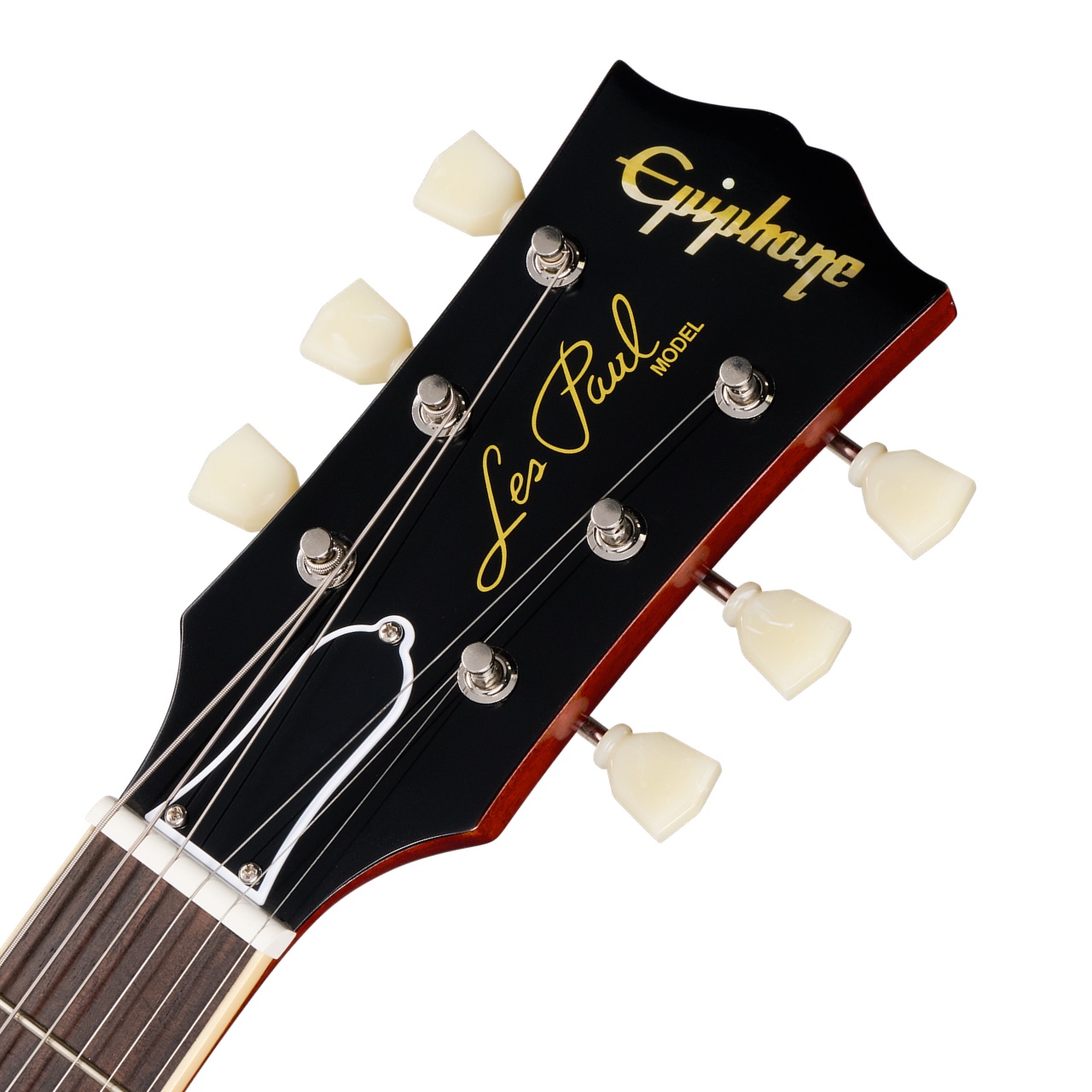 本モデルでは、ワンピース・マホガニー・ネック(ロング・ネック・テノン仕様)を採用し、豊かなサステインを実現。1959年ラウンデッド・ミディアムCネック・プロファイルを採用し、バインディングが施されたローズウッド指板を備えています。さらに、マザー・オブ・パールのトラペゾイド・インレイ、エイジド加工を施したEpiphoneロゴ、シルクスクリーン印刷されたゴールド色の「Les Paul Model」の文字が入ったギブソン・スタイルの“オープンブック”ヘッドストックを採用。サイドドットの位置やサイズも、1959年当時のLes Paul Standardと同じ仕様になっています。ジェニューイン・マホガニー材のボディにメイプル・トップが貼られ、トップには美しいAAAフレイムメイプル化粧板があしらわれています。
