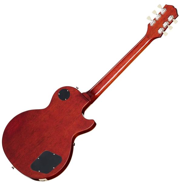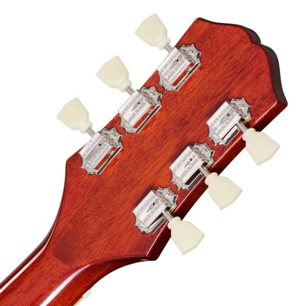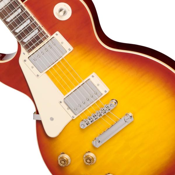 ボディ・トップにはメイプルが貼られ、上面にはAAA グレードのフレイム・メイプル化粧板があしらわれています。1959ラウンド・ミディアム・Cシェイプのネックにはバインディングが施され、ロング・ネック・テノン方式でボディにジョイントされています。ローレル指板にはクラシカルなディッシュ・インレイが施され、カラマズー・ヘッドストックにはヴィンテージ・デラックス・チューナーを搭載。電装系には定評のある2基のProbuckerハムバッカー・ピックアップ、ダイヤル・ポインタ付きのゴールド・トップハット・ノブを採用。Graph Techナット、CTSポット、往時の製法に則った配線など、拘りの仕様群により魅力が一層高められています。Epiphoneプレミアム・ギグバッグが付属となります。