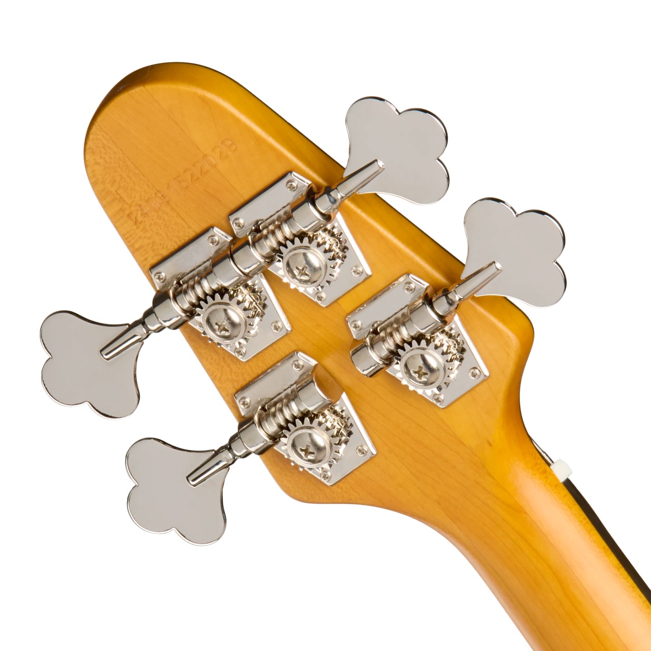 クラシックな グラバー"V"ヘッドストックにはオープンギアのベースチューナー(歴史的クローバーボタン付き)とボーンナットを搭載。弦は高密度 Leo Quan Badass IIブリッジを通り、ボディ内部を通して裏側のストリングフェルールで固定されます。これにより、アタックとサステインが向上し、完全なイントネーションとアクション調整が可能です。