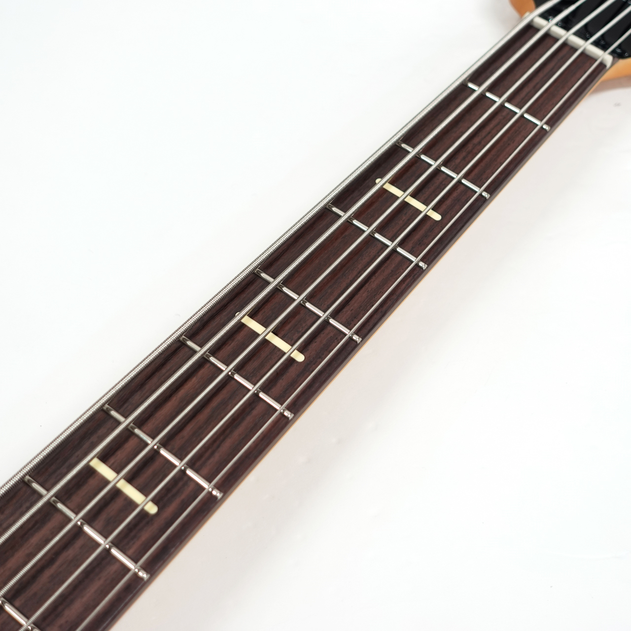 ボディ裏面から垂直にネックを固定する4本のネジに加え、ボディ裏から45度の角度でネックエンドを固定する2本のネジを追加したマイター・ボルティング方式を採用。ボディとネックを強固に密着させ、ボディとネックが一体となった強烈な鳴りを生み出します。通常のボルトオンジョイントよりも弦振動のエネルギーロスが少なく、豊かなサスティンと圧倒的な胴鳴りを実現します。