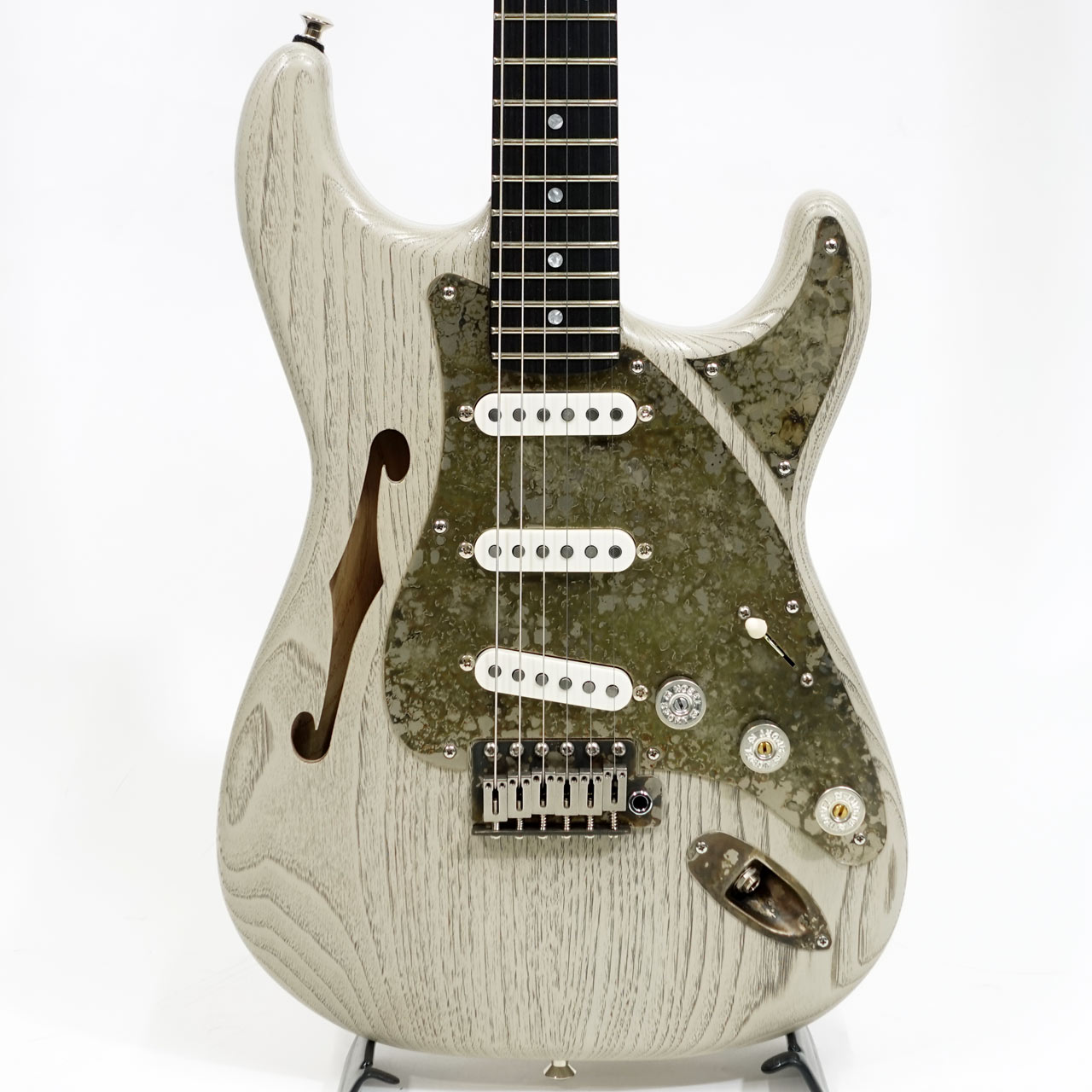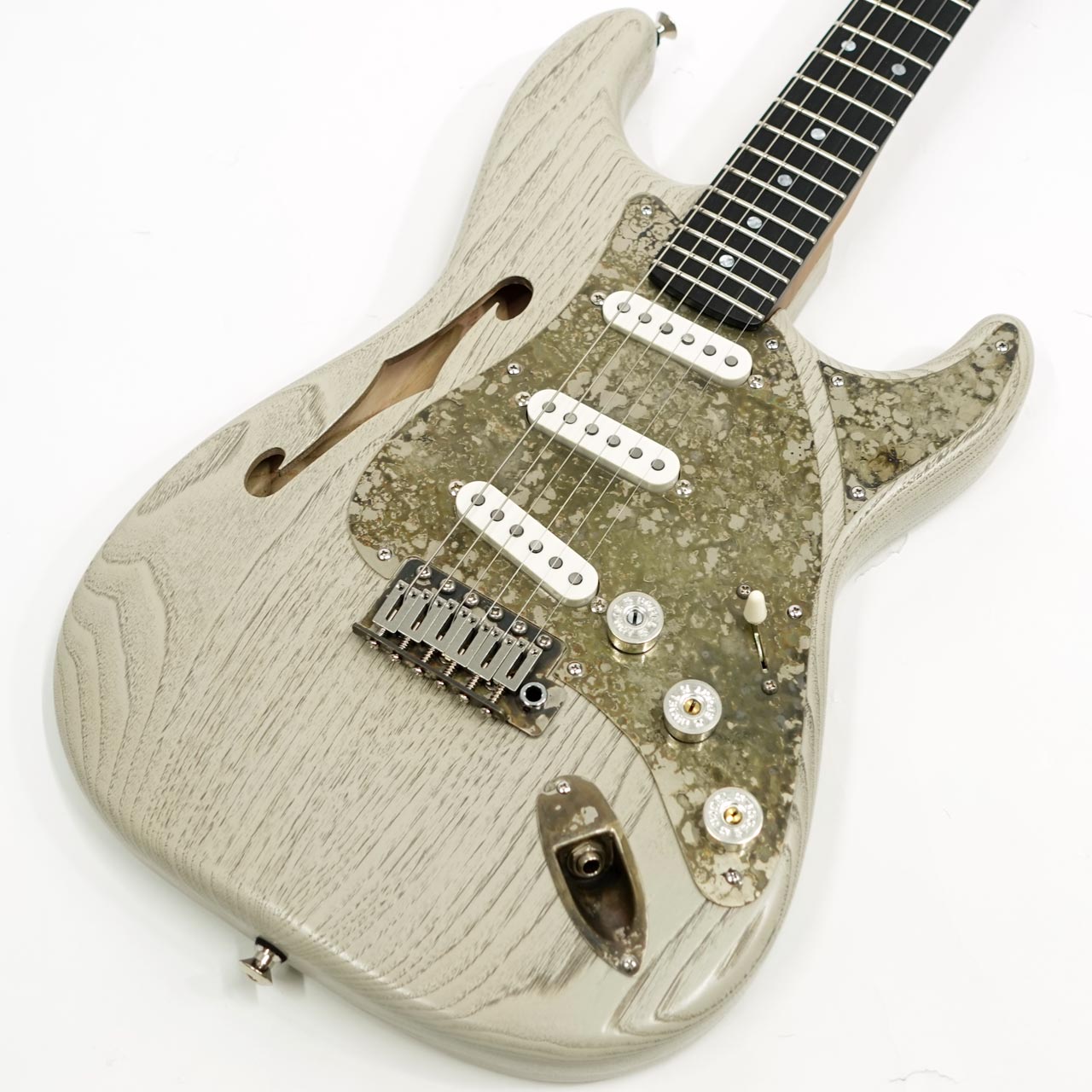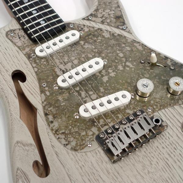 ボディ材にチェスナットをFホール搭載のセミホロウボディにて採用。チェスナットはアッシュに似たような杢目がはっきりと出る見た目ですが、中域の太さ、高域の鋭さを備えギター用材としても優れています。