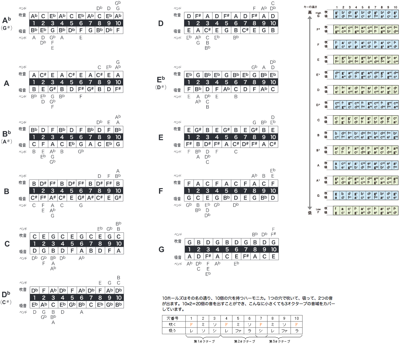 ハーモニカの豆知識世界でも最も愛用者が多く、ゆず、コブクロ、長渕剛、山崎まさよしなどの使用により若者にも大人気の10ホールズ(テンホールズ)。一番売れてる10穴 ハープがホーナー社のブルースハープということから、ブルースハープという名前の方が一般的かもしれませんが、ブルースハープは商品名ですのでご注意を。 幼稚園や小学校で童謡を吹いたハーモニカよりも小さく、また演奏方法も少し違います。ブルース音楽の象徴的な楽器であり、ロック、ニューミュージック、 フォークのプレイヤーからも愛されています。 中央の4穴で完全に1オクターブをカバーし、上下の音階は和音演奏を考慮した配列になっています。演奏されたい曲のキーに合ったハーモニカを選ぶことか ら、残念ながら1本あれば全てOK!というわけではありません。メジャー(長調)とマイナー(短調)合わせて24本のハーモニカがいることになりますが、 マイナーなどはあまり使用されませんし、必要によって揃えていくものですのでご安心下さい。まずは1本から。なんとなく始めてみたい方、何がなんだかさっ ぱり分からない方、プレゼントにちょっと...という方々にはC調がおすすめです。教室、教本などでも、最初に使用するのが多いのはC調ですので教本があ れば一人ででもぼちぼちと練習できるのではないでしょうか。曲のキーと違うハーモニカを選ぶこともありますので演奏したい曲が決まっている方はよく調べて みましょう。10穴ハープは単音でメロディを楽しむことはもちろん、同時に3個の穴に息を入れることによって和音も演奏出来るのです。選ぶハーモニカを間 違わなければアドリブでハーモニカを吹いても曲のキーから外れて音痴になる、といったこともないということですね。あとはこのハーモニカに魅力的なベンド 奏法です。ベンドは簡単にいうと音を下げる奏法のことで、少しコツが要りますがこれを取り入れることで独特のニュアンスが表現できます。 ■【樹脂(プラスティック)ボディ】...安くて初心者向けです。気密性が高いので、息を入れた時の音の立ち上がりが早く、演奏がしやすく感じられます。硬めの音で音量も大きいです。頑丈で手入れにもさほど気を遣わないとこも良いですね。 ■ 【木製ボディ】...息の入れ方が少し難しいと言われていますが出た音はとてもキレイです。木製であることから水分を木が吸収し、なじむまで少し時間がか かります。そのため樹脂製と比べ音の立ち上がりが遅く感じられます。樹脂製は本体に水分が吸収されることはないですが木は水分を含み膨張してしまうことが ありますのでお手入れをして大事にして下さい。 以上のような事はブルースハーモニカの教本で紹介されています。ハーモニカの教本の中では一番種類も多く、お近くの本屋さんでも教本は手に入るかもしれま せん。今はインターネットで少し調べれば出てくる情報もありますので、分からないことがあれば調べて見て下さいね。その他、ご不明な点やご要望などがござ いましたらお気軽にメールでお問い合わせ下さい。