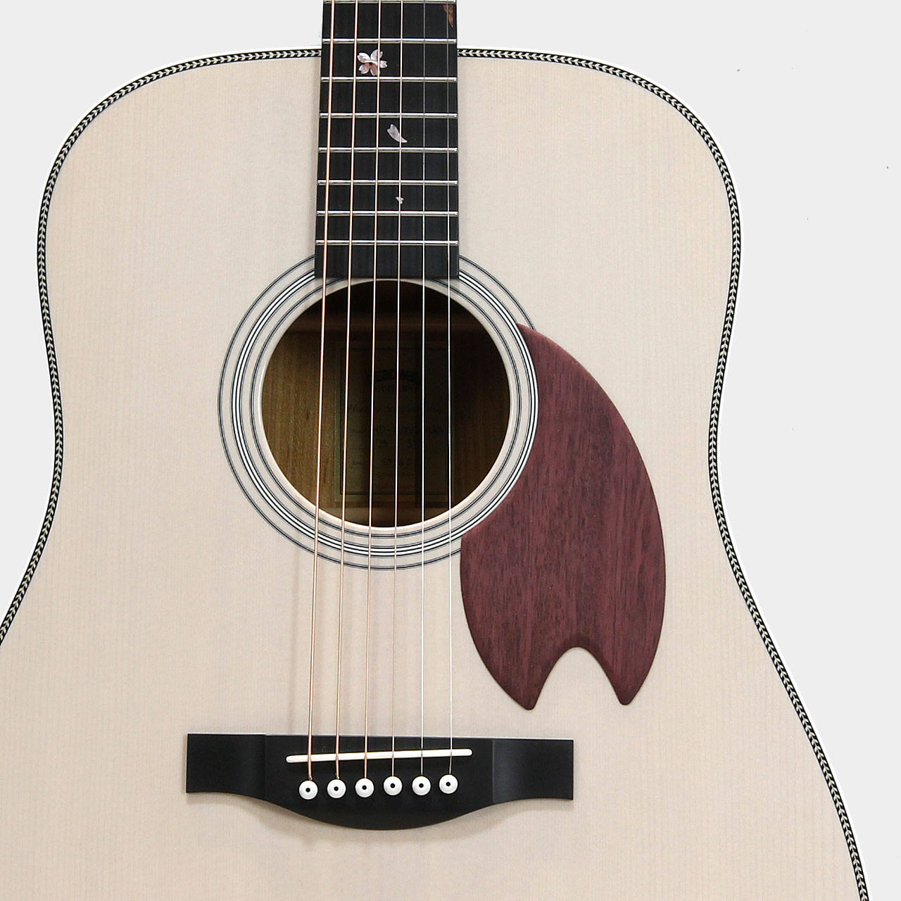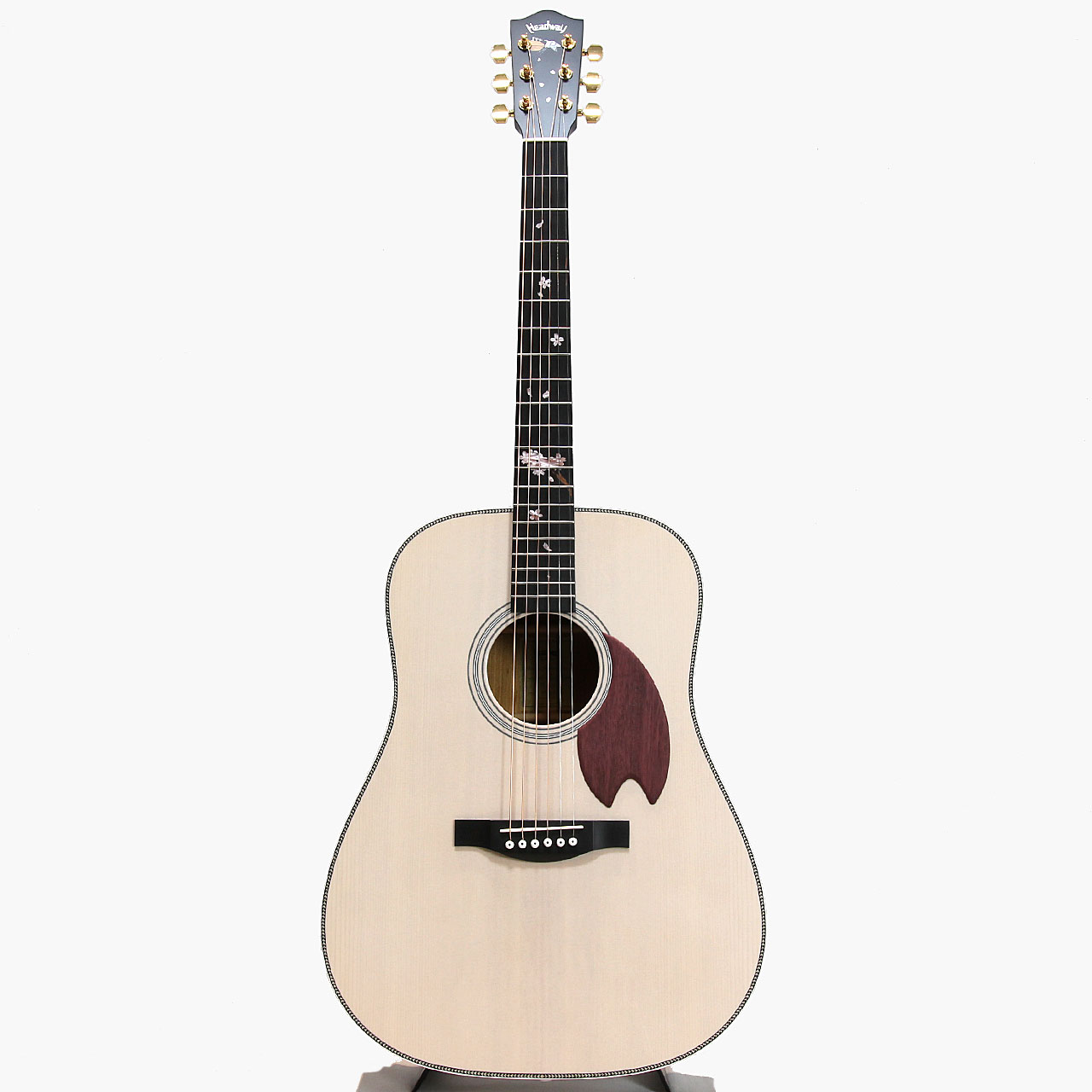 桜ギターを象徴するパープルハート材で作られた桜型のピックガード。最初に作られた一本から変わらない、Headwayの桜ギターである証です。