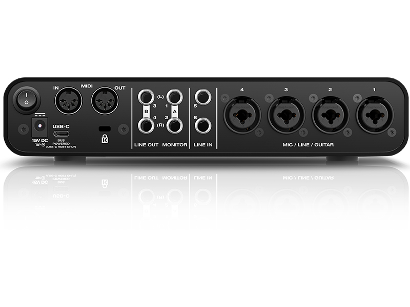 ・マイク入力ごとに個別のプリアンプゲインと 48V ファンタム電源を搭載したコンボ XLR/TRS の 4 x マイク/ライン/Hi-Z ギター入力 + 2 x バランス 1/4 インチ ライン入力