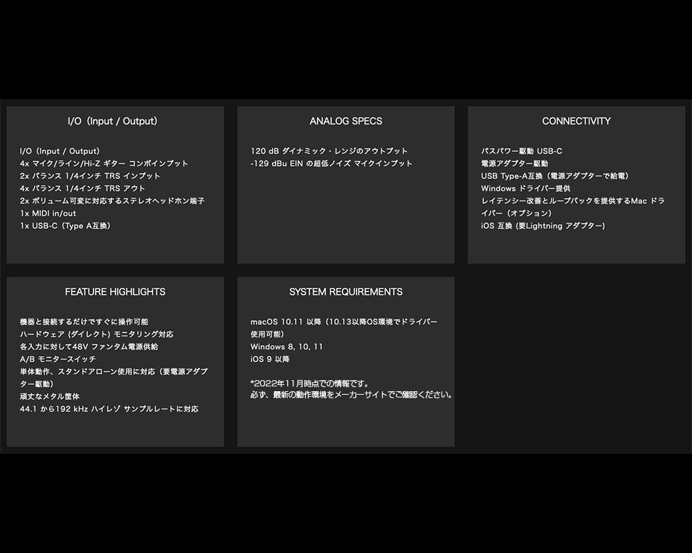 ・4 x バランス、DC カップリング 1/4 インチ TRS アウトプット:120 dB のダイナミック レンジ
