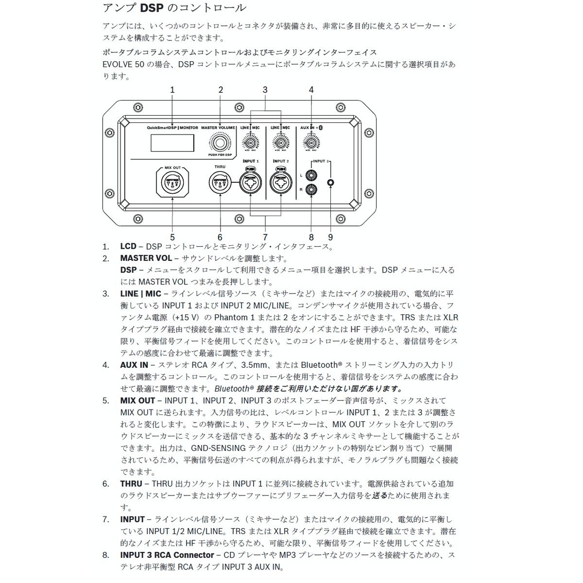 2チャンネルのLine/Micインプット、AUXインプット、MIXアウト、スルーアウトプット(ch1)搭載マスターアウトプットレベル、サブレベル、3バンドEQ(ローシェルフ、周波数特性可変可能なミッドPEQ、ハイシェルフ)、アレイディレイ