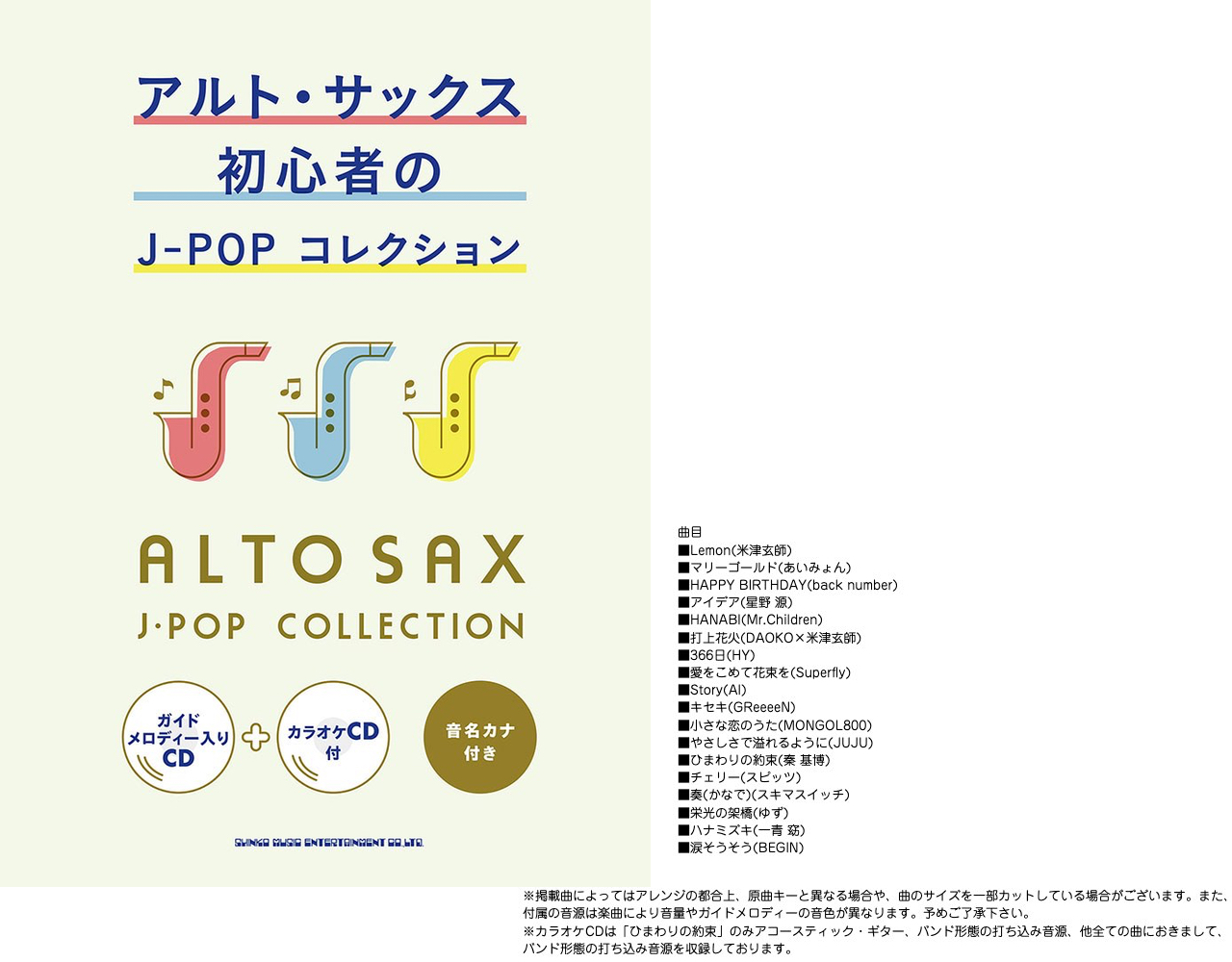 ■楽譜 シンコー 「アルトサックス初心者のJ-POPコレクション」 CD2枚付