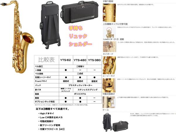 下 位モデルYTS-380との大きな違いであるネック。管楽器は口元に近づくほどよ り音色に差を感じられると言いますので、リード/マウスピース/リガチャー/ネックはこだわる箇所なのです。音の"鳴り"にこだわったこちらのモデル YTS-480は下位モデルYTS-380と異なるネックが付属しております。また、より深く音楽を楽しみ、豊かな音色を生み出したいと思ったとき、高級 モデルであるカスタムシリーズや62モデルのネックにチェンジできるのです。(ネックは単品販売がございます。)380よりは若干価格は上がりますが、初 期投資によって、自分のレベルに合わせ段階を経て長く愛用いただけます。480以上のモデルは基本オプションネック対応となります。