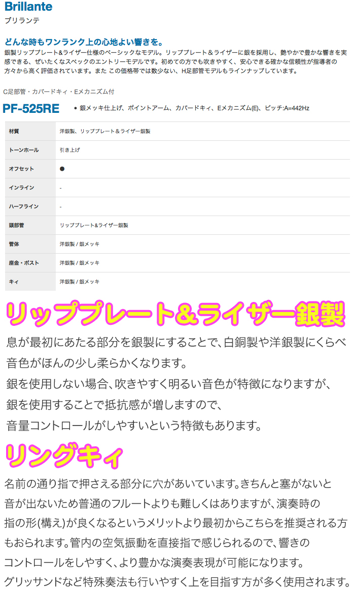ブリランテのラインナップ ・PF-525E...ストレート頭部管、カバードキイ、C管、Eメカ付き。ヤマハでいうとYFL-212LRS同等品です。 ・PF-525RE...ストレート頭部管、リングキイ、C管、Eメカ付き。ヤマハにはこの価格帯のリングキイはありません。ヤマハの一番安いリングキイはYFL-372(オフセット)、YFL-382(インライン)となり頭部管銀製からになります。 ・PF-525RBE...ストレート頭部管、リングキイ、H管、Eメカ付き。ヤマハにはこの価格帯のH管もH管リングキイもありません。一番安いものでもフィネスから上のモデルになりますので定価で30万近い価格からのラインナップです。