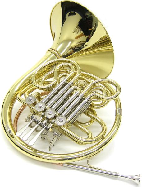 上記2つの調の管が1つになったもの。F管とB♭管の組み合わせが一般的で入門者でもこちらから使用することもあります。それぞれ独立した2つの調性をバルブで切り替えることができます。シングルに比較して音程、音色、正確性、パワーなどをレバーひとつで切り替えることで臨機応変に使い分けが出来るのですが操作性が良いということはそれだけ使用する管もパーツも多く重さがあります。フルダブルが多く使われますが、「セミダブル」というものも存在します。同じ音域ですが、全体の管の長さが少し短いセミダブルにはB♭管と、B♭管につなげてF管に出来る補正管(迂回管)がついておりフルダブルより音の出る構造が短くなります。吹奏感は異なり楽器の重さもそれだけ軽くなります。(シングルほどではない)ただしデメリットもあり、低いFの音を出す時にはF管のバルブセクションを通った後、B♭管のバルブセクションも通ることになり、管の中の凹凸を多く通る分、音が影響を受けます。