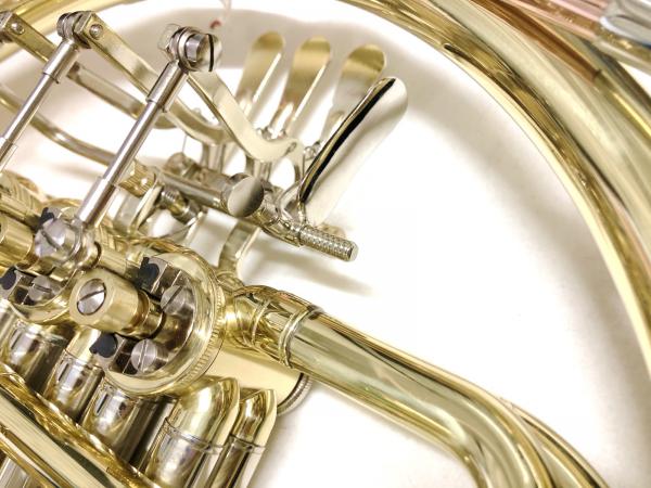 ダブルホルンは第4レバーを押してF管→B♭管に切り替える「押しB♭」での演奏が一般的ですが、こちらのモデルはその逆である「押しF」への変更が可能です。(リバースシステム)詳細は別ページ【押しF調整について】をご確認下さい。押しFへの変更/ロータリー動作チェックなど、出荷前調整と一緒でしたら無料にてご対応可能です。何かご希望などございましたらお申し付け下さいませ。