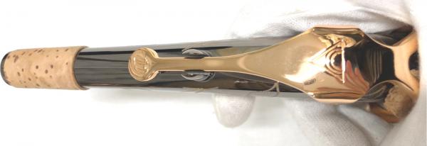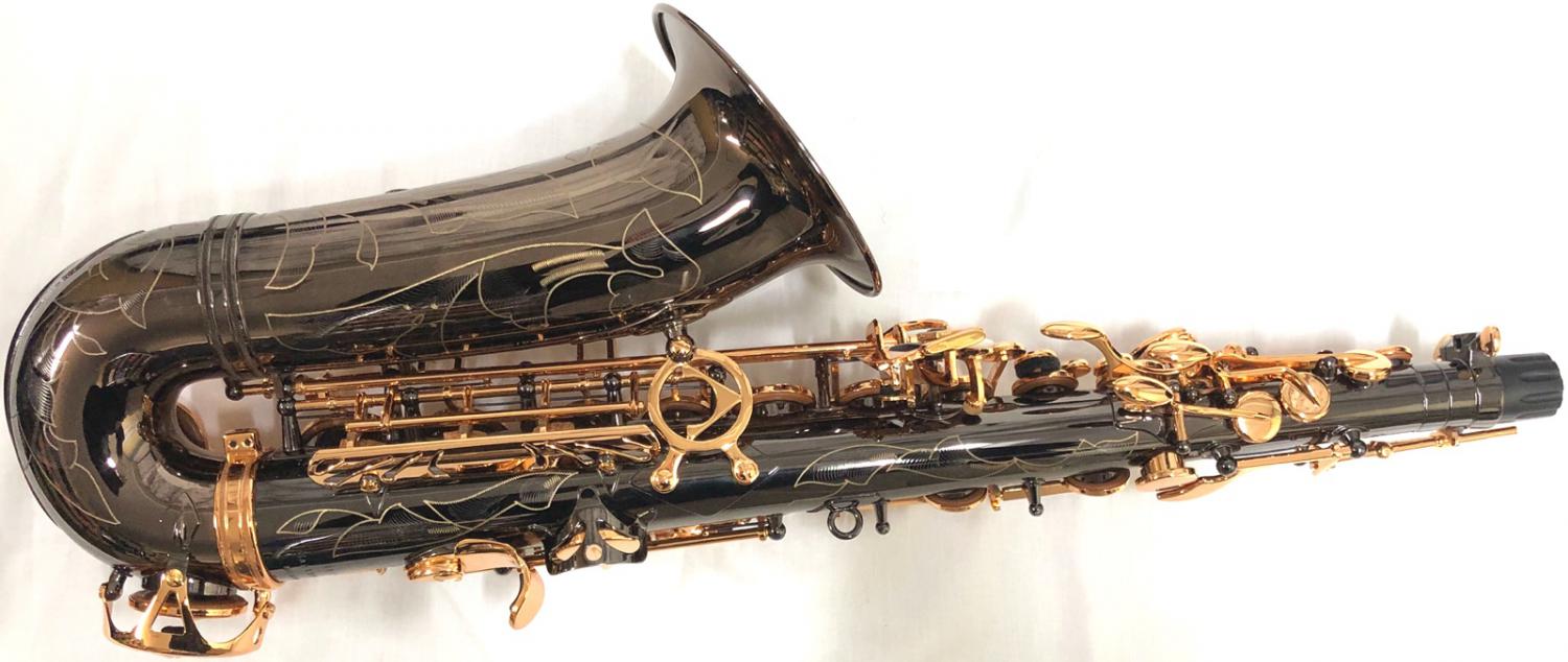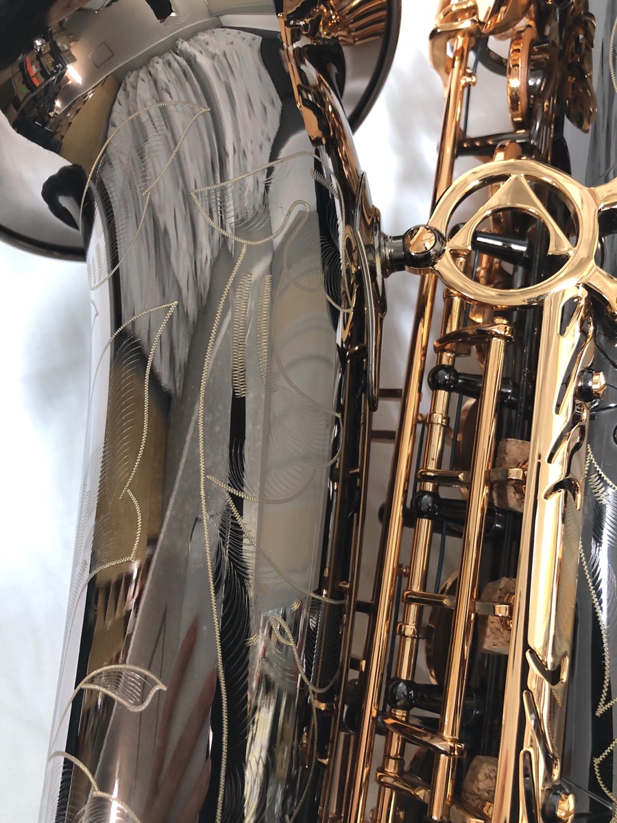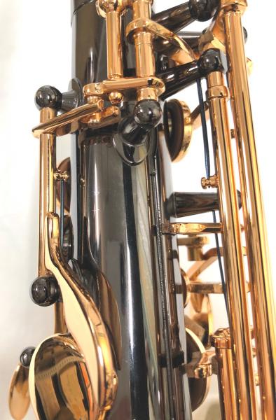 管体はブラックニッケルメッキでキイはゴールドラッカー仕上げです。ブラックの本体にパーツのゴールドがかっこいい。ブラックニッケルメッキは固めで芯のある音色。派手すぎない音色が特徴です。キイはゴールドラッカー仕上げで固めの音色にシャープで音の立ち上がりの良さが加わる傾向にあります。