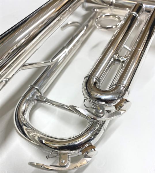 同じような色に見えても実は素材が違っていたりします。こちらは銀メッキですので外観はシルバーカラーなのですが、管体素材はイエローブラスを使用しています。ブラス=真鍮とは銅と亜鉛を混ぜたもので、この配合率によって素材の強度や色が変わり、音色、吹奏感に違いがでます。イエローブラスは定番の素材でトランペットらしい輝かしい音色での演奏を可能にしてくれます。