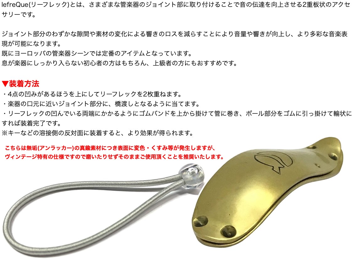 ■lefreQue Vintage Brass 33mm 管楽器のジョイント部に取り付けることで音の伝達を向上させる2重板状のアクセサリーです。 ジョイント部分のわずかな隙間や素材の変化による響きのロスを減らすことにより音量や響きが向上し、より多彩な音楽表現が可能になります。
