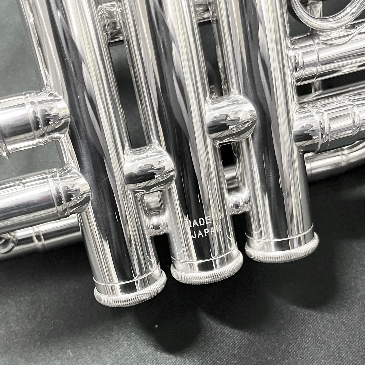 ぱっと見はだいたい金か銀ですが、塗装の違いで濃いゴールド、薄いゴールドの違いがあったりもします。塗装の違いで音色や吹奏感にも違いがでてきます。YCR-6335SIIは銀メッキ仕上げです。