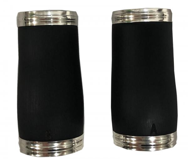 マウスピース下の樽のような部分が二種類ついています。音程は湿度などによっても変化しますので、季節や気候に応じて使い分けして頂けます。サイズ自体はほんの少しの違いになりますが、管楽器では大事なピッチ調整に順応します。クラリネットのチューニングは管を抜いて音程を少し下げたりするのですが、管を全て入れてしまってもまだ高すぎる場合、吹き方(アンブシュア)での調節が必要になります。初心者にはなかなかそれが難しいのです。