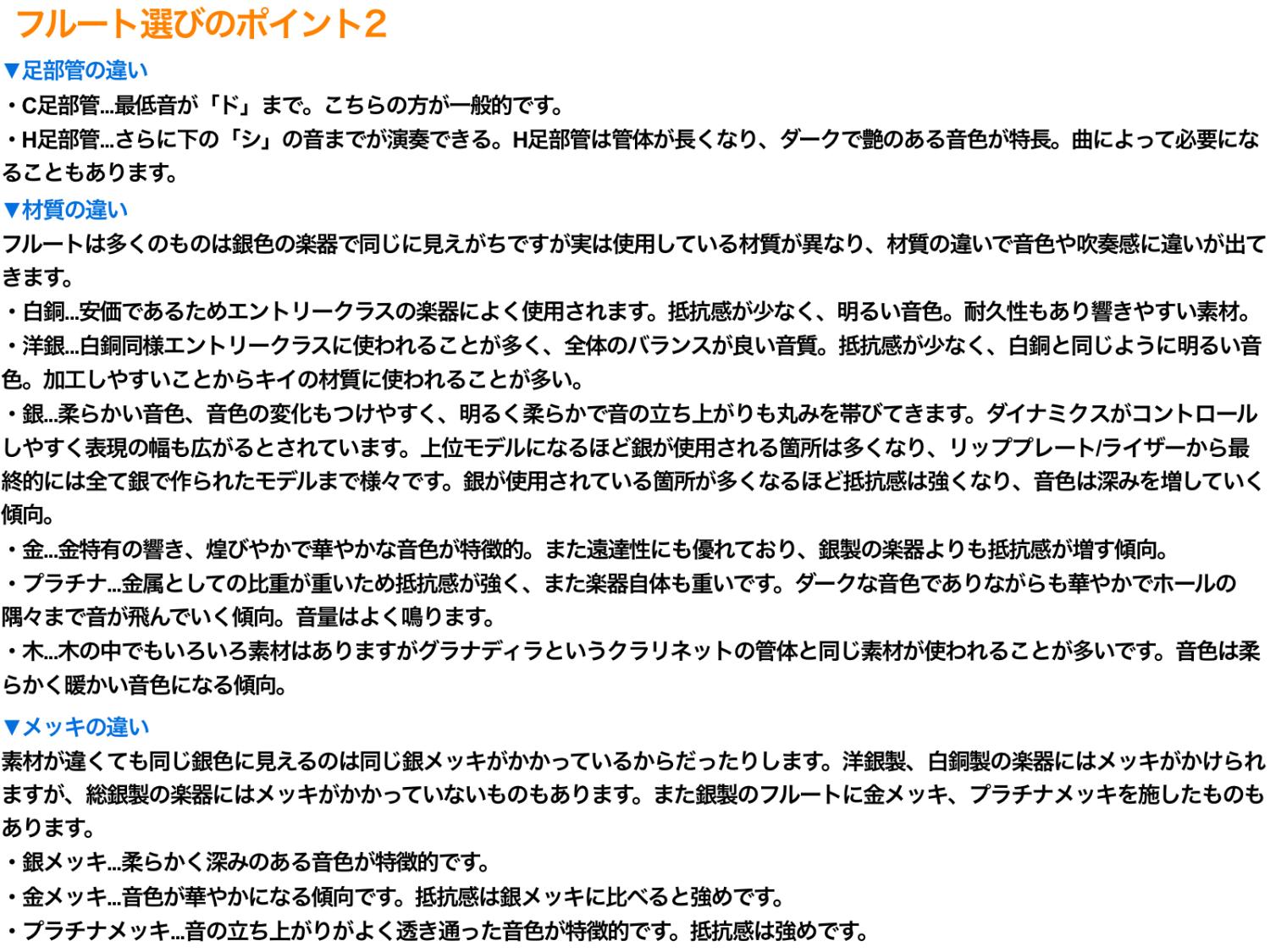☆H足部管...さらに下の「シ」の音までが演奏できる。H足部管は管体が長くなり、ダークで艶のある音色が特長。曲によって必要になることもあります。