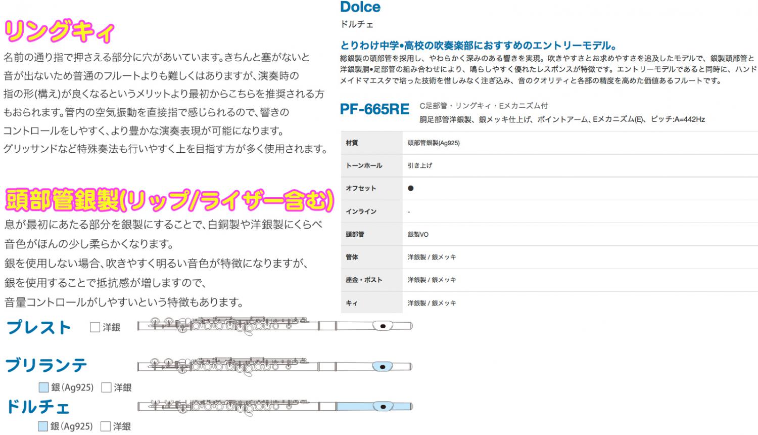 ■商品名  : PF-665RE リングキイ フルート 頭部管 銀製 ドルチェ Eメカニズム オフセット Dolce flute PF665RE リーフレック セット K 北海道 沖縄 離島不可