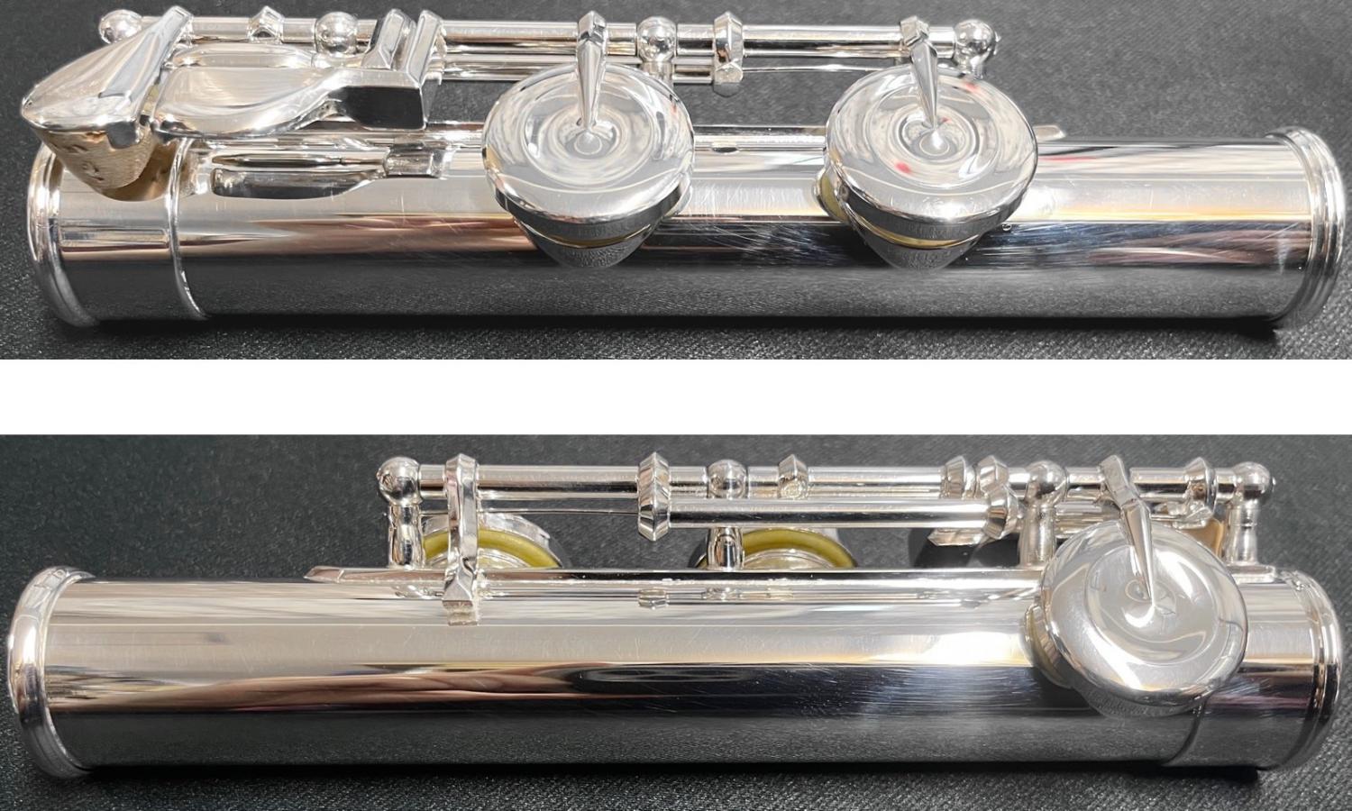素材が違くても同じ銀色に見えるのは同じ銀メッキがかかっているからだったりします。洋銀製、白銅製の楽器にはメッキがかけられますが、総銀製の楽器にはメッキがかかっていないものもあります。また銀製のフルートに金メッキ、プラチナメッキを施したものもあります。FL-300Sは銀メッキです。