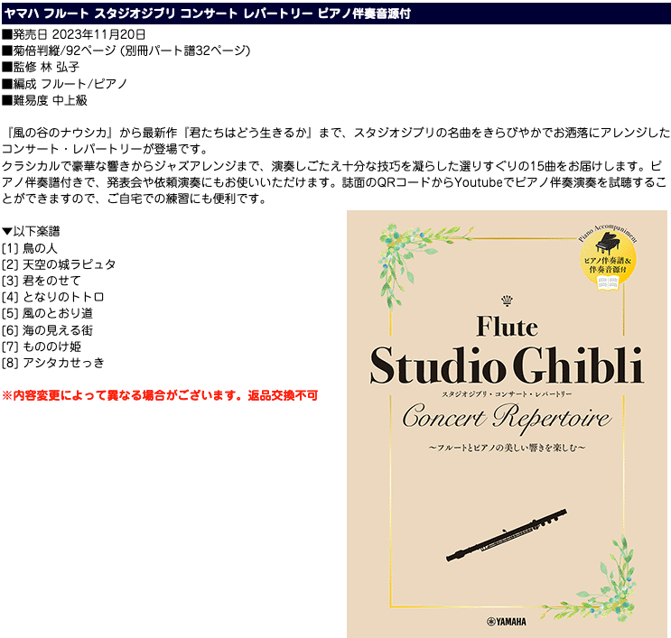 ■ヤマハ楽譜 フルート スタジオジブリ コンサート レパートリー ピアノ伴奏音源付