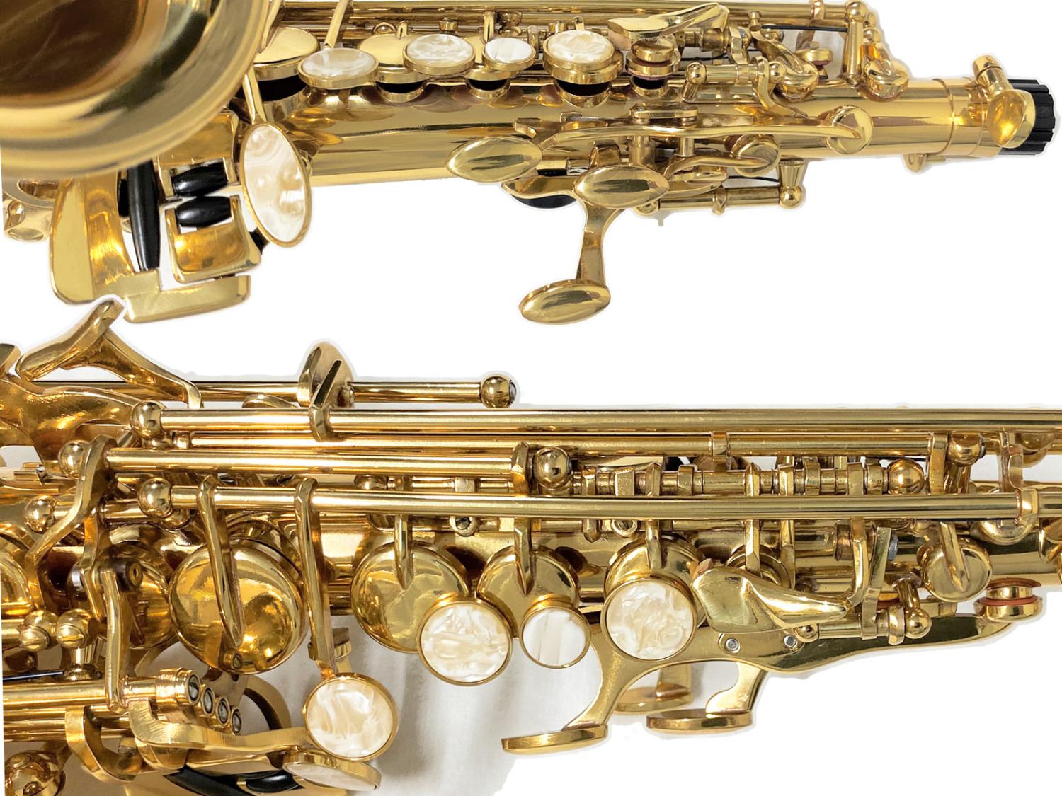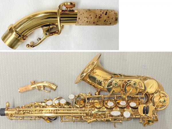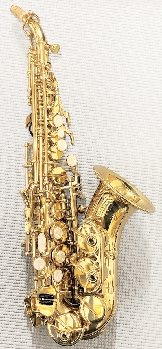 一見小さいアルトサックスのように見えるかわいい外観。通常ソプラノサックスはストレートが使われることが多いですが、こちらも人気が出てきています。