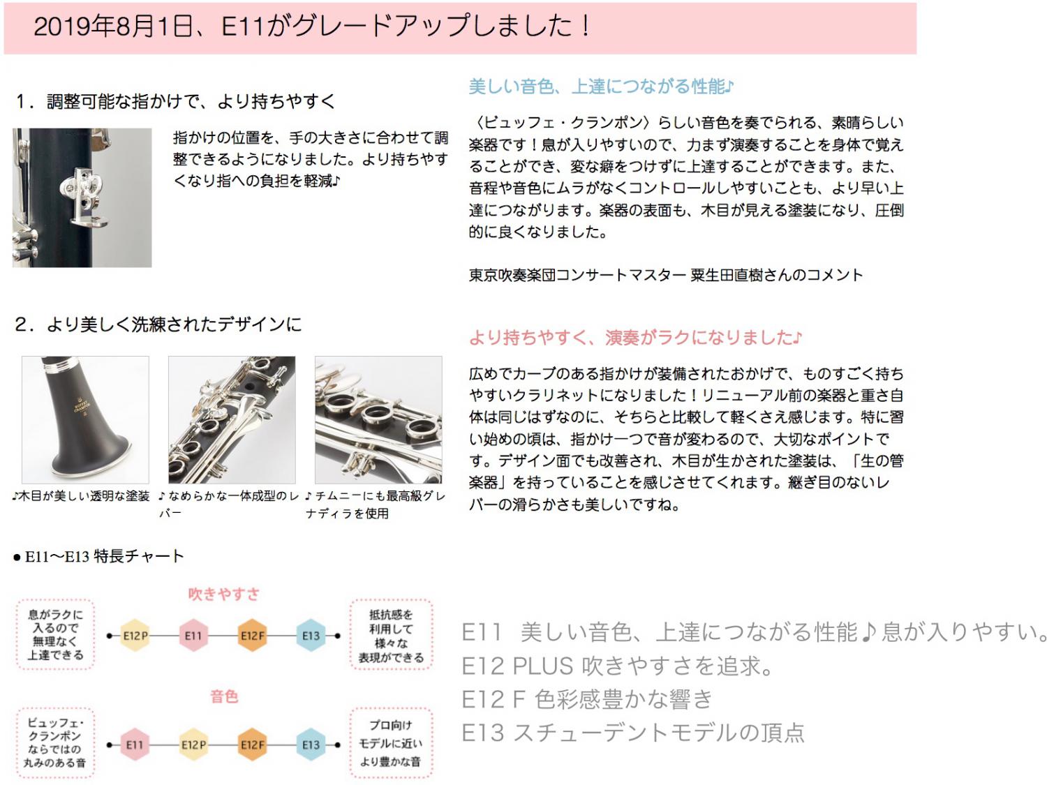 ・上位モデルE12...木材の材質がシリーズごとで少しづつ良いものになります。またストラップ用リングつきの調節可能指かけつきでより構えやすく吹きやすくなるメリットがあります。ベルリングも付いています。E12は2種類あり、その違い、他上位モデルとの違いはE12のページにてご確認下さい。