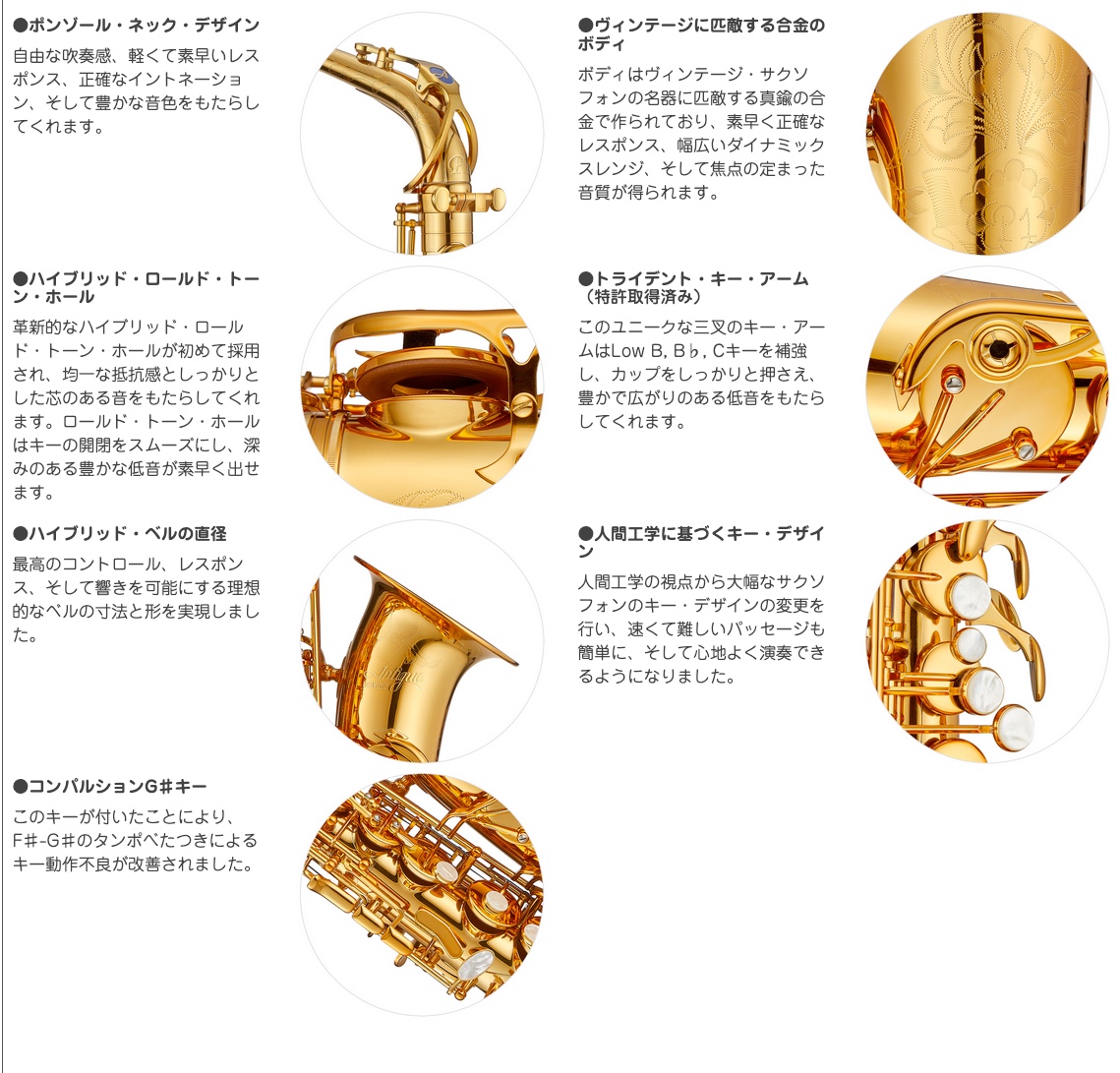 ボディはヴィンテージ・サクソフォンの名器に匹敵する真鍮の合金で作られており、素早く正確なレスポンス、幅広いダイナミックスレンジ、そして焦点の定まった音質が得られます。