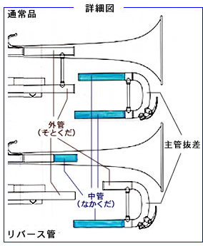 ☆リバース管とは...通常のものですと主管抜差は、両側ともに中管(なかくだ)となっています。リバース管と呼ばれるものは、主管抜差の吹込管側が外管(そとくだ)となっています。つまり、吹込管側に中管に相当するものがあります。これにより、主管抜差でピッチを調整した際にスキマ(急激に内径の広がる部分)のできる位置が通常品とリバース管では異なりますので、場合によっては吹込管のテーパーを長く取ることが可能になります。一概には言えませんが、吹奏時に通常のものと比較して抵抗感が少ないので、吹きやすさを感じられる傾向が見られます。