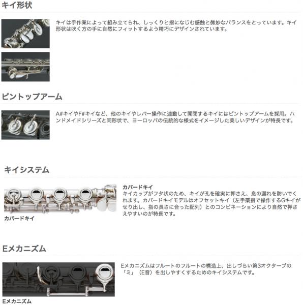 ■Eメカニズム(フルートの構造上、出しづらい第3オクターブの「ミ」(E音)を出しやすくするためのキイシステムです。 E音は古典派やロマン派の美しい旋律や、現代曲の技術的に高度な作品にも多用され、Eメカニズムは極めて有効なシステムといえます。)
