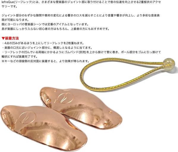 ■lefreQue ( リーフレック ) レッドブラス 41mm...管楽器のジョイント部に取り付けることで音の伝達を向上させる2重板状のアクセサリーです。 ジョイント部分のわずかな隙間や素材の変化による響きのロスを減らすことにより音量や響きが向上し、より多彩な音楽表現が可能になります。