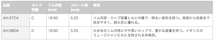 【特長】...リム内径・カップ容量ともに中庸で、明るい音色を持つ。高音から低音まで吹きやすく、耐久性に優れる。