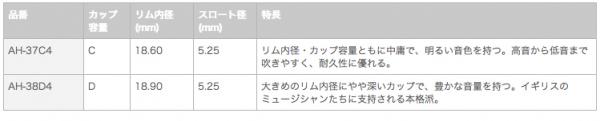 コンピューター制御の最新加工機による高精度なマウスピース。スムーズなアタック、コントロールのしやすさ。ひとりひとりのスタイルに応える多彩なラインナップを用意しています。テナーホーン用として、AH-37C4、AH-38D4の2種類。