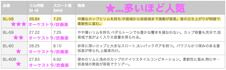 マウスピースの種類が豊富なのは「楽器・個人との相性」「演奏する楽曲」「求める音」によって使い分ける方や好みのものを使うからであって、一概にどれが良い、どれが悪いということではありません。