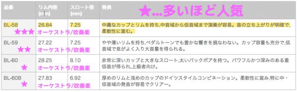 【特長】...中庸なカップとリムを持ち,中音域から低音域まで演奏が容易。音の立ち上がりが明確で,柔軟性に富む。