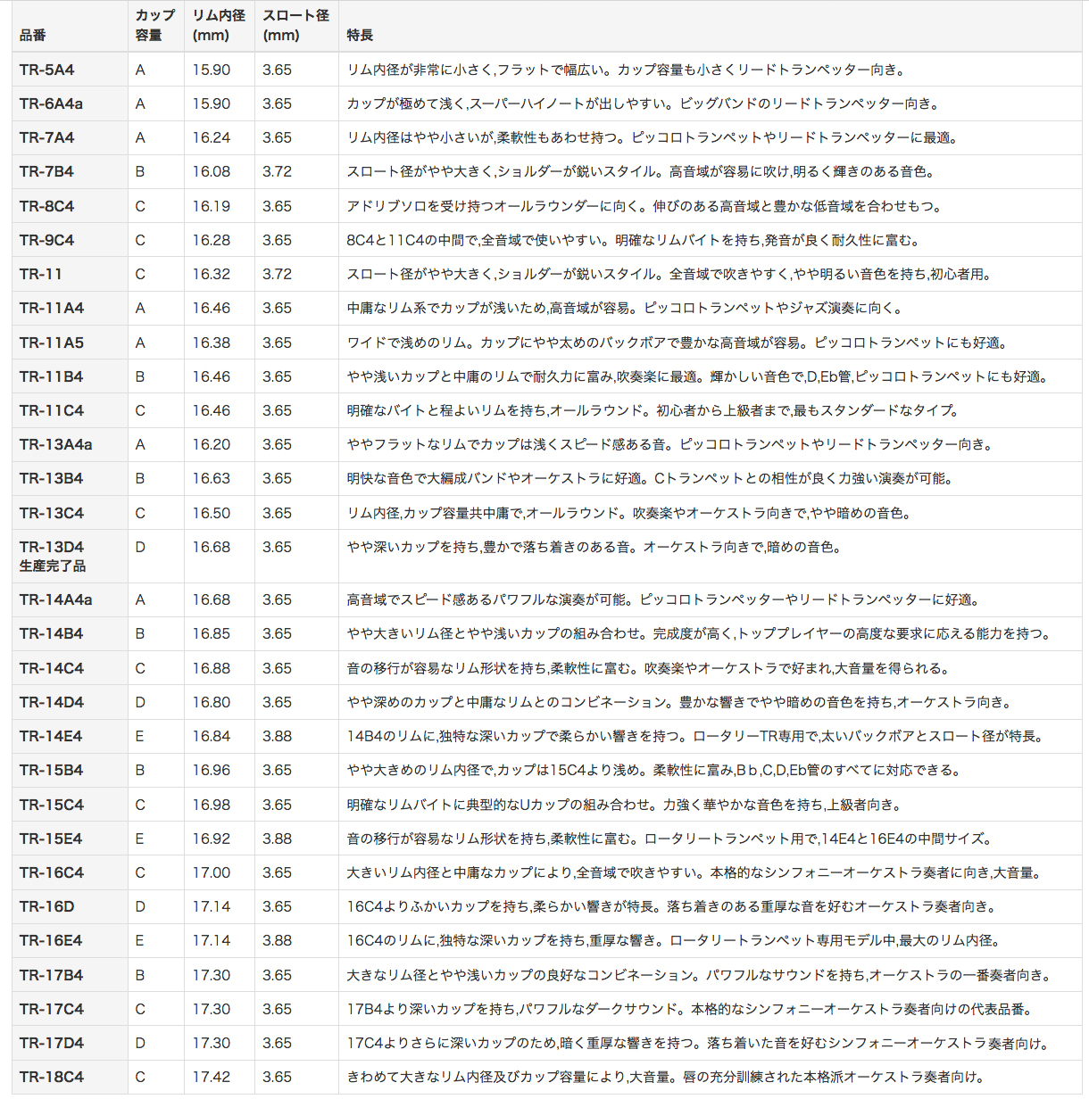 TR-18C4 C 17.42 3.65 きわめて大きなリム内径及びカップ容量により,大音量。唇の充分訓練された本格派オーケストラ奏者向け。