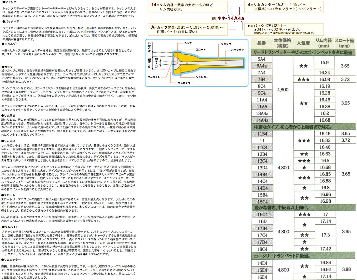 TR-13C4 C 16.50 3.65 リム内径,カップ容量共中庸で,オールラウンド。吹奏楽やオーケストラ向きで,やや暗めの音色。