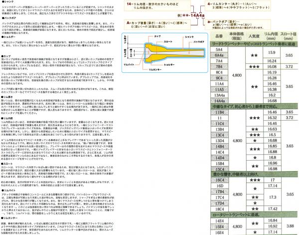 TR-5A4 A 15.90 3.65 リム内径が非常に小さく,フラットで幅広い。カップ容量も小さくリードトランペッター向き。