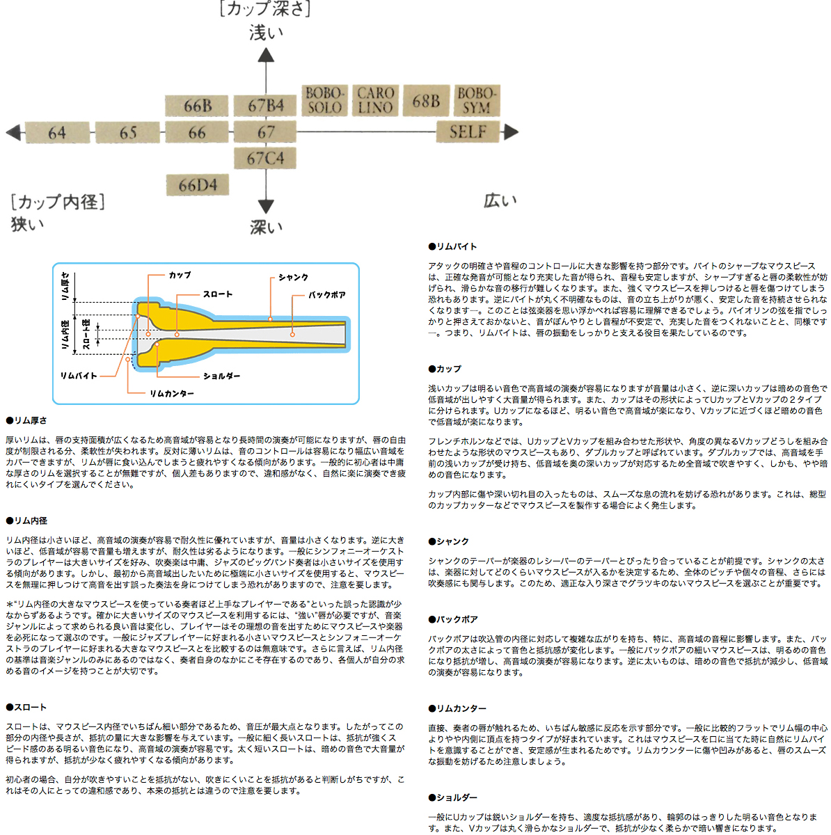 ■BB-67:非常にバランスの良いリム・カップを持ち,演奏が容易。Bb管やC管,さらにEb管との相性も良く,音のまとまり良好。