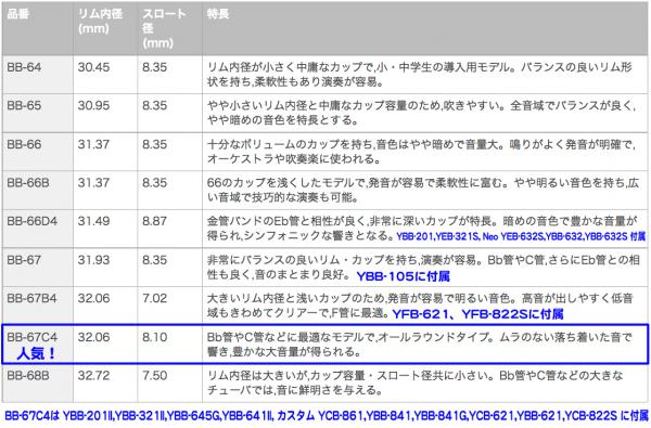 ■BB-67:非常にバランスの良いリム・カップを持ち,演奏が容易。Bb管やC管,さらにEb管との相性も良く,音のまとまり良好。
