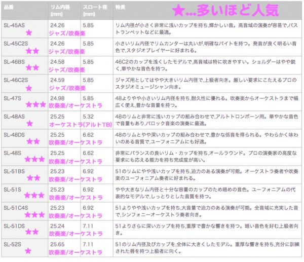 SL-51S リム内径 25.23mm スロート径 6.92mm 特徴:やや大きなリム内径と十分な容量のカップのため暗めの音色。ユーフォニアムの代表的なモデルで,しっとりとした音質を持つ。