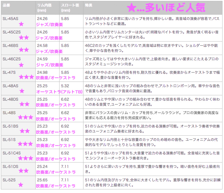 SL-47S リム内径 24.98mm スロート径 5.85mm 特徴:48よりやや小さいリム内径を持ち,耐久性に優れる。吹奏楽からオーケストラまで幅広く使え,豊かな音量を持つ。