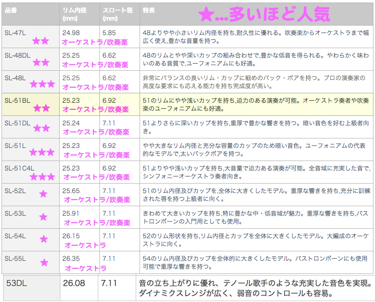 SL-48DL リム内径 25.25mm スロート径 6.62mm 特徴:48のリムとやや深いカップの組み合わせで,豊かな低音を得られる。やわらかく味わいのある音質で,ユーフォニアムにも好適。