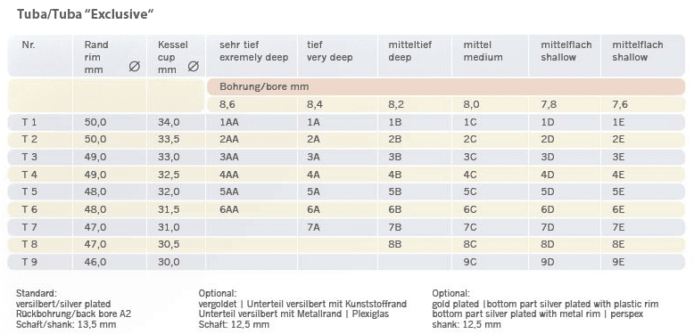 リム内径は小さいほど、高音域の演奏が容易で耐久性に優れていますが、音量は小さくなります。逆に大きいほど、低音域が容易で音量も増えますが、耐久性は劣 るようになります。一般にシンフォニーオーケストラのプレイヤーは大きいサイズを好み、吹奏楽は中庸、ジャズのビッグバンド奏者は小さいサイズを使用する 傾向があります。しかし、最初から高音域出したいために極端に小さいサイズを使用すると、マウスピースを無理に押しつけて高音を出す誤った奏法を身につけ てしまう恐れがありますので、注意を要します。 *“リム内径の大きなマウスピースを使ってい る奏者ほど上手なプレイヤーである”といった誤った認識が少なからずあるようです。確かに大きいサイズのマウスピースを利用するには、“強い”唇が必要で すが、音楽ジャンルによって求められる良い音は変化し、プレイヤーはその理想の音を出すためにマウスピースや楽器を必死になって選ぶのです。一般にジャズ プレイヤーに好まれる小さいマウスピースとシンフォニーオーケストラのプレイヤーに好まれる大きなマウスピースとを比較するのは無意味です。さらに言え ば、リム内径の基準は音楽ジャンルのみにあるのではなく、奏者自身のなかにこそ存在するのであり、各個人が自分の求める音のイメージを持つことが大切で す。