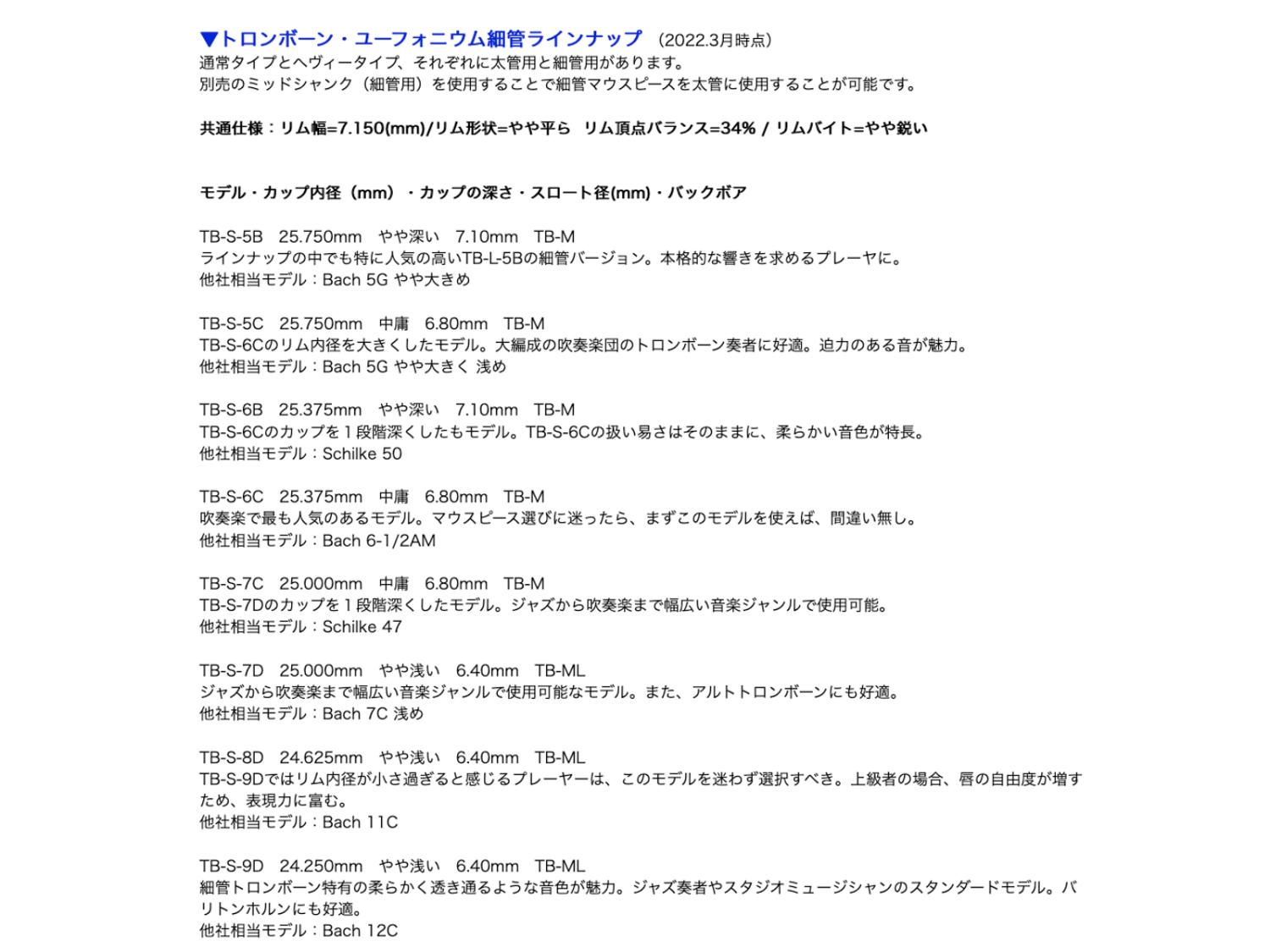 ■特徴:TB-S-9Dではリム内径が小さ過ぎると感じるプレーヤーは、このモデルを迷わず選択すべき。上級者の場合、唇の自由度が増すため、表現力に富む。