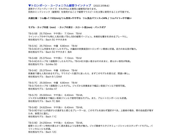 ▼トロンボーン・ユーフォニウム細管ラインナップ (2022.3月時点)