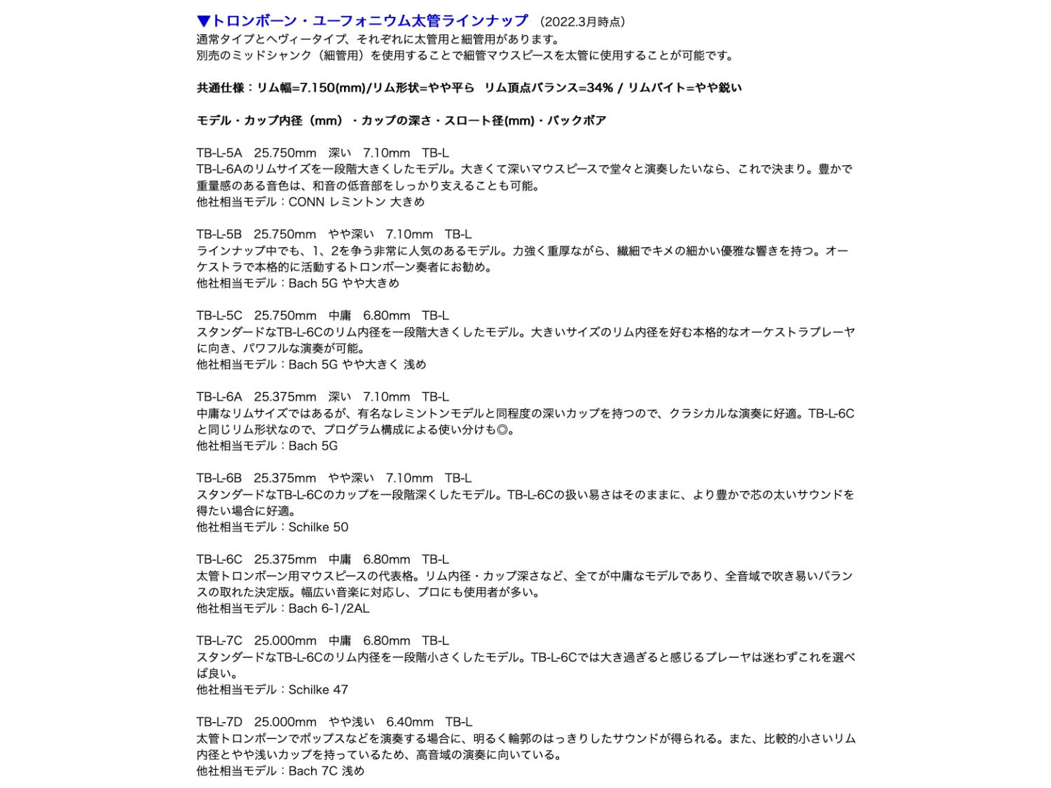 中庸なリムサイズではあるが、有名なレミントンモデルと同程度の深いカップを持つので、クラシカルな演奏に好適。TB-L-6Cと同じリム形状なので、プログラム構成による使い分けも◎。